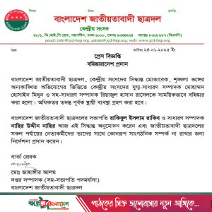 শুক্রবার রাতে ছাত্রদলের দপ্তর (সহসভাপতি মর্যাদা) সম্পাদক জাহাঙ্গীর আলম স্বাক্ষরিত এক বিজ্ঞপ্তিতে একথা জানানো হয়।