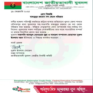 বিজ্ঞপ্তিতে বলা হয়, দলীয় শৃঙ্খলা পরিপন্থি কর্মকাণ্ডে জড়িত থাকার অভিযোগে খুলনা জেলা শাখার দৌলতপুর থানা যুবদলের সহসভাপতি মাহবুবুর রহমানকে দল থেকে বহিষ্কার করা হয়েছে। বহিষ্কৃত নেতৃবৃন্দের কোনো অপকর্মের দায়-দায়িত্ব দল নেবে না। যুবদলের সকল পর্যায়ের নেতাকর্মীদের তার সঙ্গে সাংগঠনিক সম্পর্ক না রাখার নির্দেশনা প্রদান করা হয়েছে।