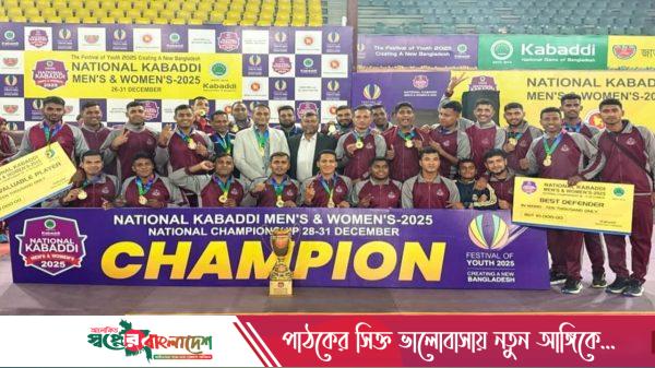 ‘জাতীয় কাবাডি ২০২৫’-এর পুরুষ বিভাগে চ্যাম্পিয়ন হওয়ার গৌরব অর্জন করেছে বর্ডার গার্ড বাংলাদেশ (বিজিবি)। শনিবার (৩ জানুয়ারি) বিকেলে ঢাকার পল্টনে শহীদ এম. মনসুর আলী জাতীয় হ্যান্ডবল স্টেডিয়ামে অনুষ্ঠিত পুরুষ বিভাগের