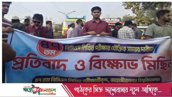 ৪৭তম বিসিএসের লিখিত পরীক্ষা পেছানোর দাবিতে ঢাকা-আরিচা মহাসড়ক অবরোধ করেছেন জাহাঙ্গীরনগর বিশ্ববিদ্যালয়ের (জাবি) চাকরিপ্রার্থী শিক্ষার্থীরা। মঙ্গলবার (২৫ নভেম্বর) দুপুর সাড়ে ১২টা থেকে ২টা পর্যন্ত এ অবরোধ করেন তারা। শিক্ষার্থীরা জানান,
