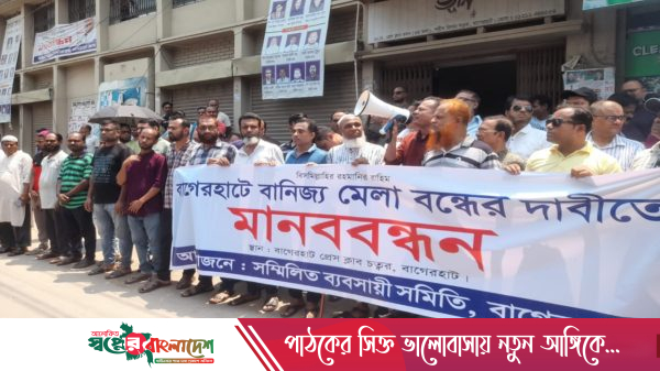 বাগেরহাট পৌর পার্কে আসন্ন বাণিজ্য মেলা বন্ধের দাবিতে মানববন্ধন অনুষ্ঠিত হয়েছে।বৃহস্পতিবার (৮ এপ্রিল) বাগেরহাট প্রেসক্লাবের সামনে ঘণ্টাব্যাপী এই মানববন্ধনের আয়োজন করে জেলার সম্মিলিত ব্যবসায়ী সমিতি। মানববন্ধনে সভাপতিত্ব করেন সংগঠনের আহ্বায়ক