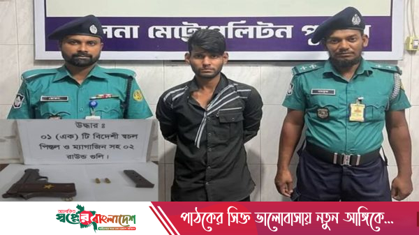 খুলনা মহানগরীর হরিণটানা থানা পুলিশ অভিযান চালিয়ে একটি বিদেশী স্বচল পিস্তল, একটি ম্যাগাজিন ও দুই রাউন্ড পিস্তলের গুলিসহ মোঃ হাফিজুল শেখ (২৪) নামের এক যুবককে গ্রেফতার করেছে। হরিণটানা থানার এসআই