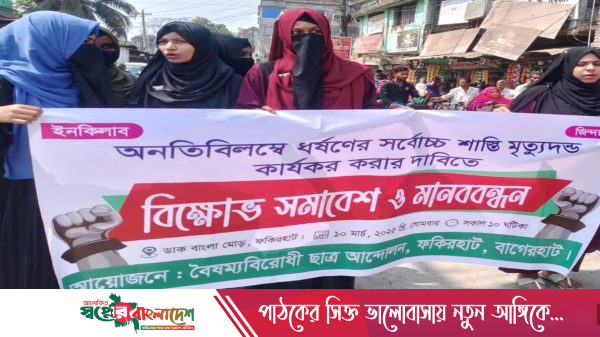 বাগেরহাটের ফকিরহাটে বৈষম্য বিরোধী ছাত্র আন্দোলনের আয়োজনে মাগুরায় ৮ বছরের শিশু আছিয়া ধর্ষণ সহ সারাদেশে প্রতিনিয়ত নারী-শিশু ধর্ষণের প্রতিবাদে মানববন্ধন ও বিক্ষোভ সমাবেশ অনুষ্ঠিত হয়েছে। সোমবার (১০ মার্চ ) সকাল