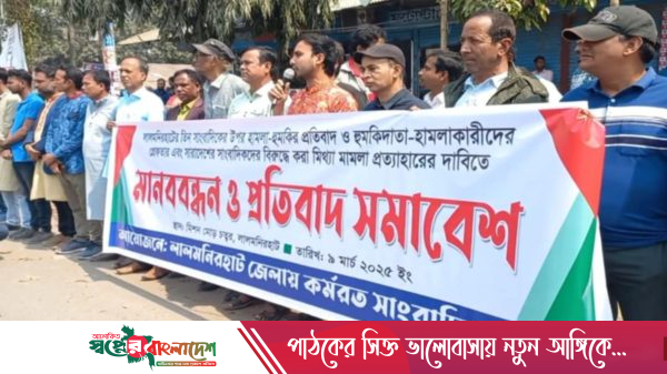 লালমনিরহাটে সম্প্রতি তিনজন সাংবাদিকের ওপর হামলা ও হুমকির প্রতিবাদে মানববন্ধন ও প্রতিবাদ সমাবেশ অনুষ্ঠিত হয়েছে। রবিবার (৯ মার্চ) জেলা শহরের মিশনমোড় চত্বরে এই কর্মসূচির আয়োজন করেন জেলার সংবাদকর্মীরা। সাংবাদিকদের ওপর