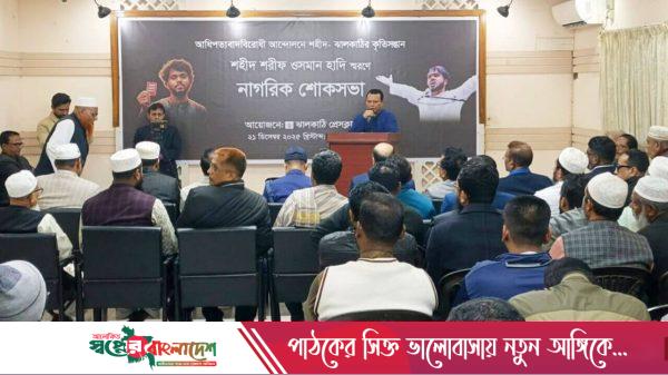 আততায়ীর গুলিতে নিহত ইনকিলাব মঞ্চ ও ইনকিলাব কালচারাল সেন্টারের প্রতিষ্ঠাতা এবং ত্রয়োদশ জাতীয় সংসদ নির্বাচনে ঢাকা-৮ আসনের সম্ভাব্য স্বতন্ত্র প্রার্থী শহীদ শরিফ ওসমান বিন হাদির স্মরণে ঝালকাঠিতে নাগরিক শোকসভা অনুষ্ঠিত