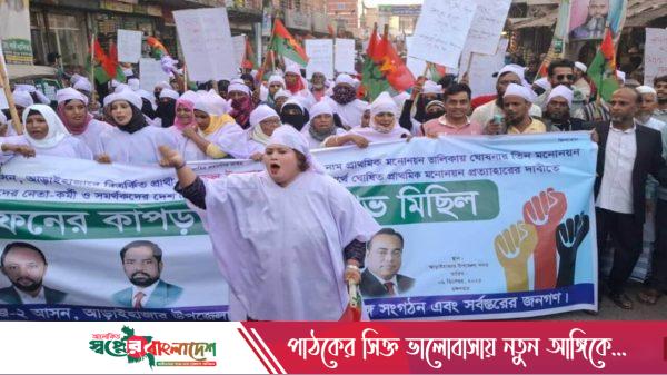 নারায়ণগঞ্জ-২ (আড়াইহাজার) আসনে বিনপির মনোনয়ন পরিবর্তনের দাবিতে কাফনের কাপড় পরে মিছিল করেছে মনোনয়নবঞ্চিত তিন প্রার্থীর নেতাকর্মী ও সমর্থকরা। মঙ্গলবার (৯ ডিসেম্বর) বিকেলে উপজেলার ব্রাহ্মণদি থেকে শুরু করে মিছিলটি সদরের বিভিন্ন