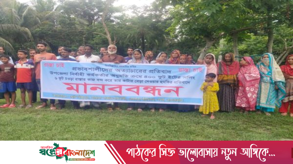 বাগেরহাটের সদর উপজেলার বেমরতা ইউনিয়নের ছোট বিষ্ণুপুর গ্রামে মাত্র ৪০০ ফুট রাস্তার কাজ বন্ধ হয়ে যাওয়ায় দুর্ভোগে পড়েছেন শতাধিক গ্রামবাসী। শুক্রবার (১৫ আগস্ট) বিকেলে তিন মাসের শিশুকে কোলে নিয়ে মানববন্ধনে