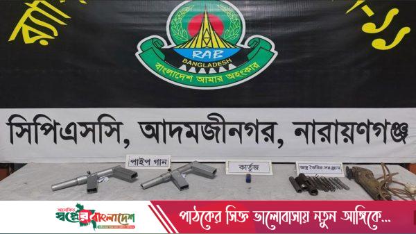 নারায়ণগঞ্জের আড়াইহাজার থেকে পরিত্যক্ত অবস্থায় দুটি পাইপগান, এক রাউন্ড গুলি ও অস্ত্র তৈরির সরঞ্জাম উদ্ধার করেছে র্যাব-১১। রোববার (৮ ফেব্রুয়ারি) রাত সাড়ে ১২টায় আড়াইহাজার থানার বালিয়াপাড়া গ্রামের বাসিন্দা আব্দুল হামিদের