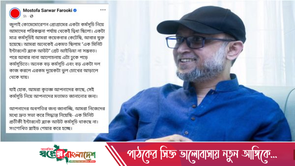 জুলাই ‘পুনর্জাগরণ’ অনুষ্ঠানমালার অংশ হিসেবে ঘোষিত ‘ইন্টারনেট ব্ল্যাকআউট’ কর্মসূচি সরকার বাতিল করেছে বলে জানিয়েছেন সংস্কৃতি উপদেষ্টা মোস্তফা সরয়ার ফারুকী। বৃহস্পতিবার (৩ জুলাই) নিজের ভেরিফায়েড ফেসবুক আইডিতে দেয়া এক পোস্টে তিনি