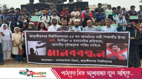 জাহাঙ্গীরনগর বিশ্ববিদ্যালয়ের (জাবি) ৫৩তম আবর্তনের এক নারী শিক্ষার্থীর ওপর ধর্ষণ, নিপীড়ন ও হত্যাচেষ্টার ঘটনার প্রতিবাদে এবং অভিযুক্ত এস এম তারিকুল ইসলামের দৃষ্টান্তমূলক শাস্তির দাবিতে মানববন্ধন ও মৌন মিছিল করেছে বিশ্ববিদ্যালয়ের